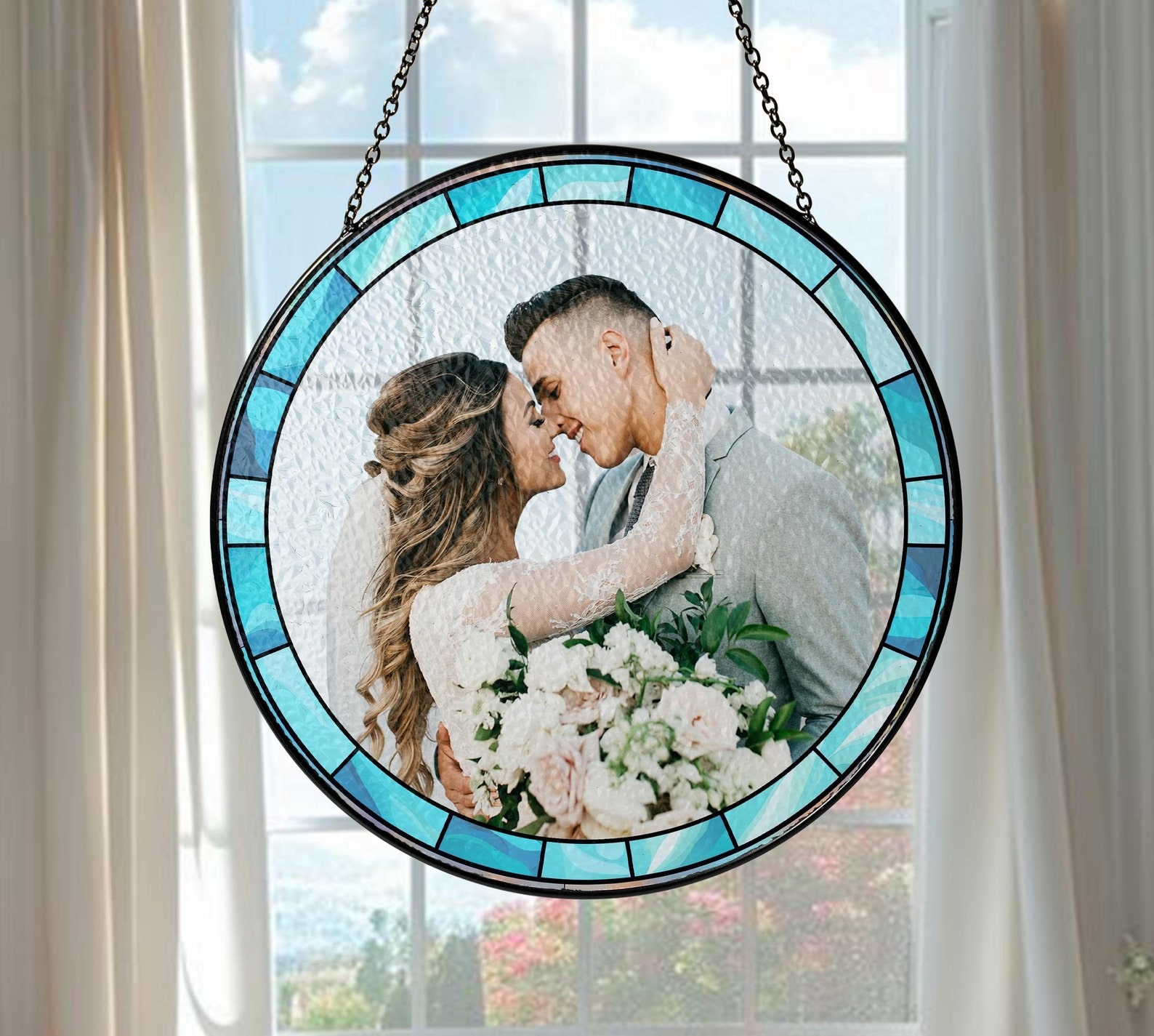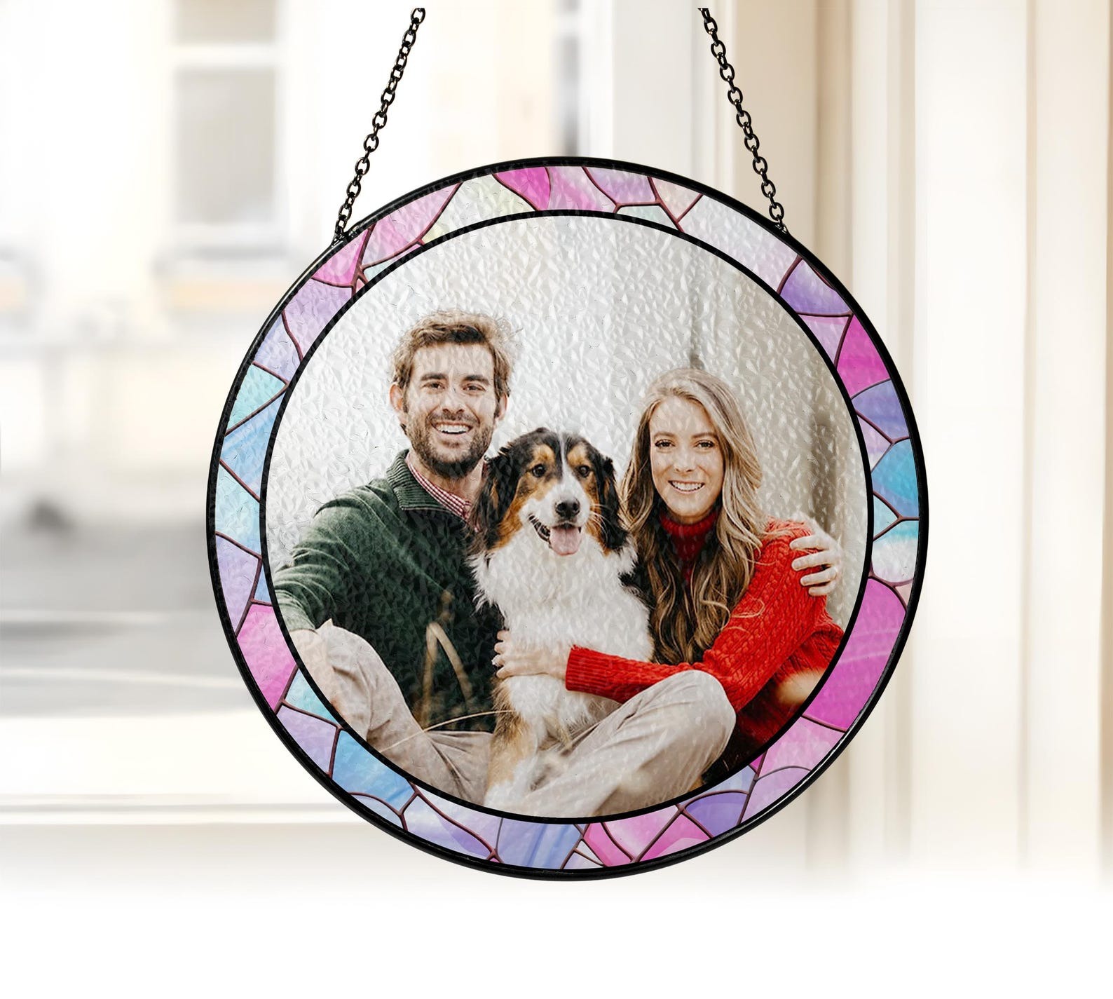 Hanging Design: Integrated hooks with a sleek black metal chain and a suction cup for easy installation in any window or space.