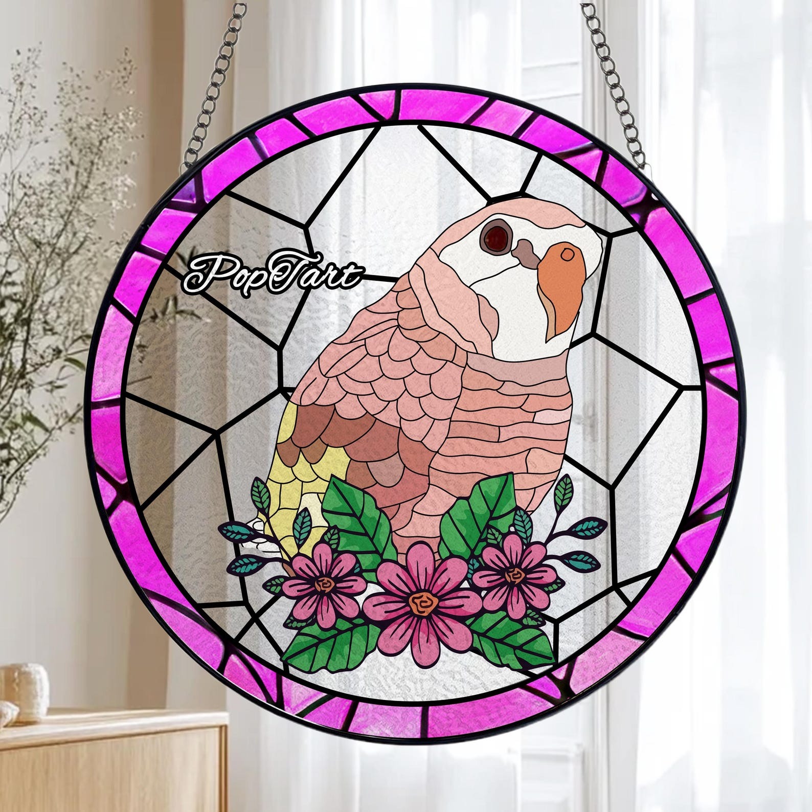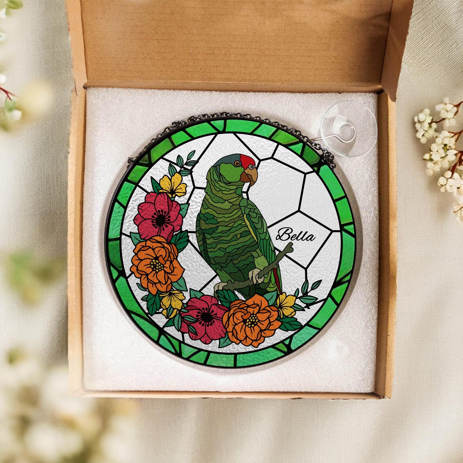 Hanging Design: Integrated hooks with a sleek black metal chain and a suction cup for easy installation in any window or space.