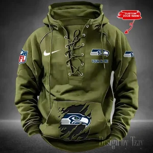 Seattle Seahawks Lace-Up Cross V-Neck Drawstring Hoodie